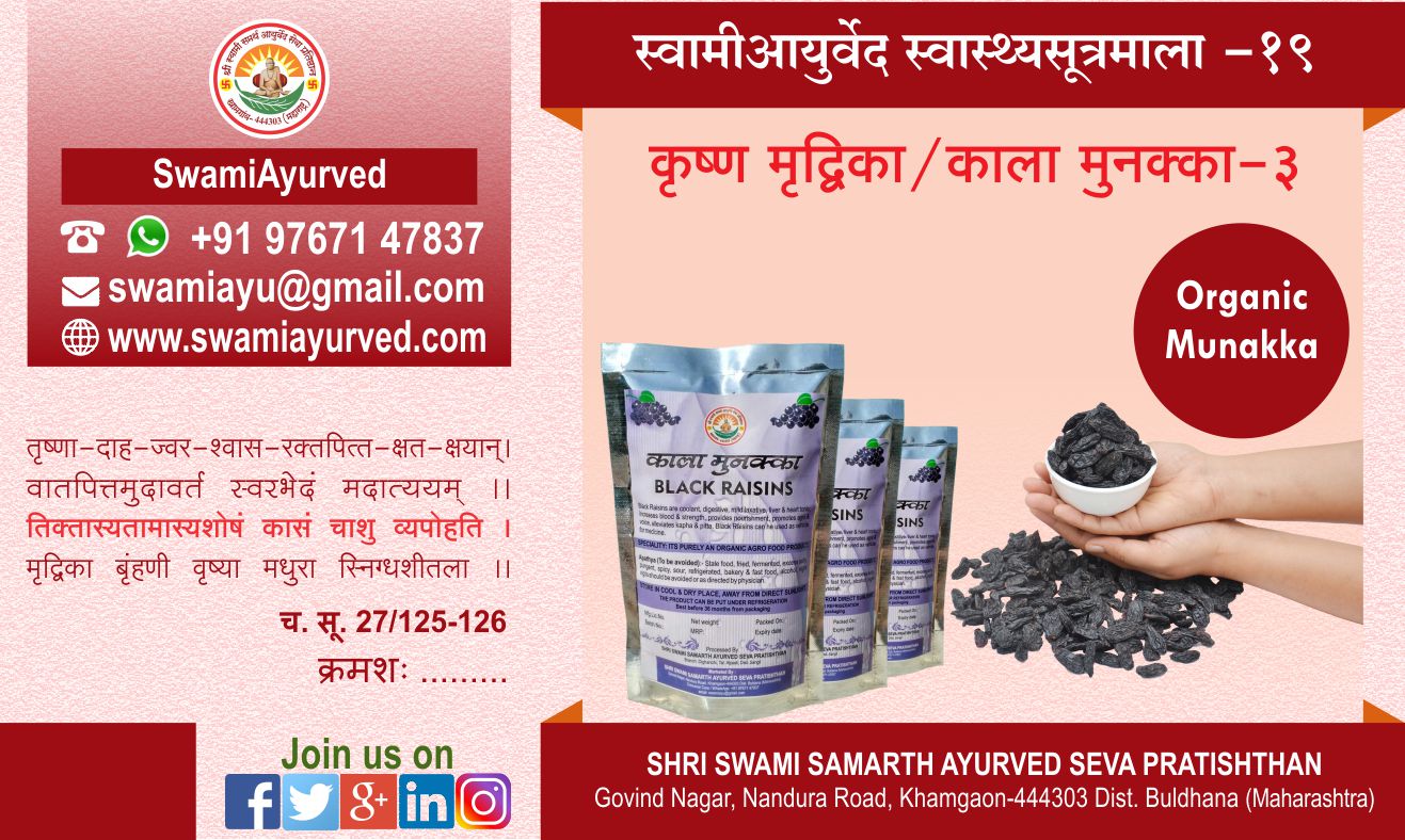 वेदौषधी निर्माणशाला काला मुनक्का सेंद्रिय पद्धती से विकसित किया गया होने से, उपरोक्त सभी गुणधर्मों की उपलब्धि उसमे पूर्णतः होती है।