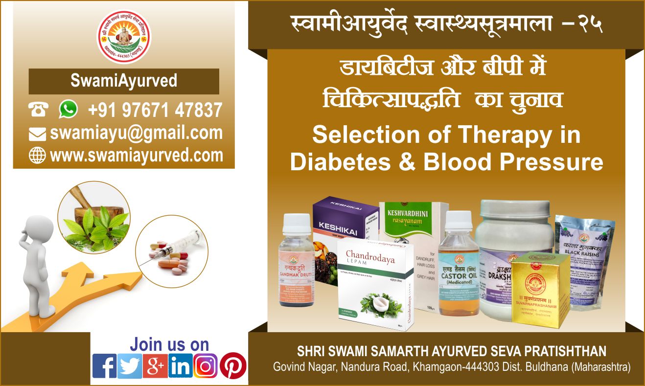 स्वातंत्र्योत्तर काल मे बदली हुई जीवनशैली ने कुछ नये व्याधियों को भी जन्म दिया। मधुमेह (Diabetics) और उच्च रक्तचाप (Hypertension or Blood pressure) ये दोनो व्याधी इसी बदली हुई जीवनशैली का प्रसाद है। मधुमेह से पीडित लोगों की संख्या मे भारत का स्थान तिसरा है और उच्च रक्तचाप के कुल 18% नये रुग्णों का प्रतिवर्ष निदान होता है। ऐसे व्याधियों का जब भी निदान (diagnosis) होता है तभी से रुग्ण एलोपैथी औषधियाँ लेना शुरू कर देता है। क्यों कि आजकल एलोपैथी लोगो की पहली पसंद है। एलोपैथी औषधियाँ लेना आसान है। सर्वत्र आसानी से उपलब्ध है। कही भी लाई-ले जा सकती है। डायबिटीज और बी.पी. के लिए उपयोग मे लाने जानेवाली प्राथमिक औषधियाँ (Basic molecules) सस्ती भी है। उपर से आयुर्वेद जैसा कोई खास परहेज नही। जो चाहे वो खाओ और औषधियाँ लेते रहो। एलोपैथी औषधियों से रक्तशर्करा और बी.पी. तुरंत कम भी हो जाता है। परंतु अगर उपरोक्त सभी बातें सच है, तो फिर आज तक मधुमेह और उच्च रक्तचाप का पृथ्वी से निर्मूलन हो जाना चाहिए था। पर ऐसा कही हुआ है - ये तो कही न देखने मे है, न ही सुनने मे। उलटा नियमित रूप से औषधी शुरू होने के बाबजूद भी, रक्तशर्करा नियंत्रण मे रहने के बावजूद भी मोतियाबिंद का आगमन जल्दी हो जाता है। हाथ और पैरो के तलुओ मे जलन होना शुरू हो जाती है। ब्लडप्रेशर बढना शुरू हो जाता है। किडनी (वृक्क) की कार्मुकता (working capacity) कम होना शुरू हो जाती है। उपरोक्त लक्षण लेके रुग्ण जब डॉक्टर के पास जाता है तब डॉक्टर रक्तशर्करा की जाँच कर लेते है और जाँच मे तो रक्तशर्करा सामान्य ही पाई जाती है। फिर भी उपरोक्त लक्षण उत्पन्न होकर उनकी प्रगति शुरू ही रहती है। इसका स्पष्ट अर्थ तो यही हुआ की व्याधी से शरीर का रक्षण करने के लिए जिन औषधियों पर विश्वास किया, उन्होने ही धीमे धीमे पूर्ण शरीर का भक्षण कर लिया।