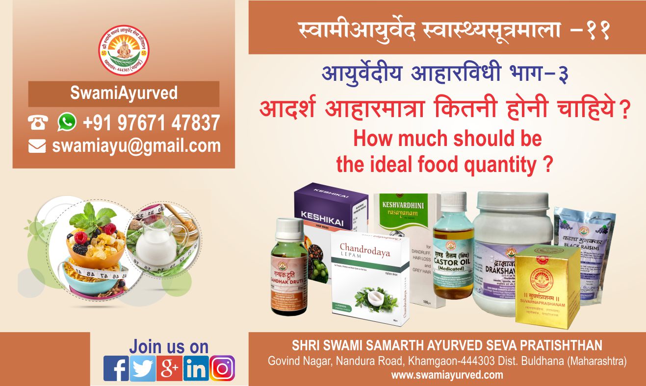 आयुर्वेदीय आहारविधी का तिसरा नियम है - मात्राशी स्यात्। अर्थात आहार सदैव उचित मात्रा में ही लेना चाहिए। अब यह 'उचित मात्रा' (Optimum quantity) मतलब कितनी मात्रा? तो आयुर्वेद इसकी व्याख्या करता है 'अग्निबलापेक्षिणी' अर्थात प्रत्येक व्यक्ति की उचित मात्रा यह उस व्यक्ति के पाचकाग्नि के बल (ताकत) पर निर्भर करती है। इसीलिए सबके लिए एक ही मात्रा का निर्धारण ......